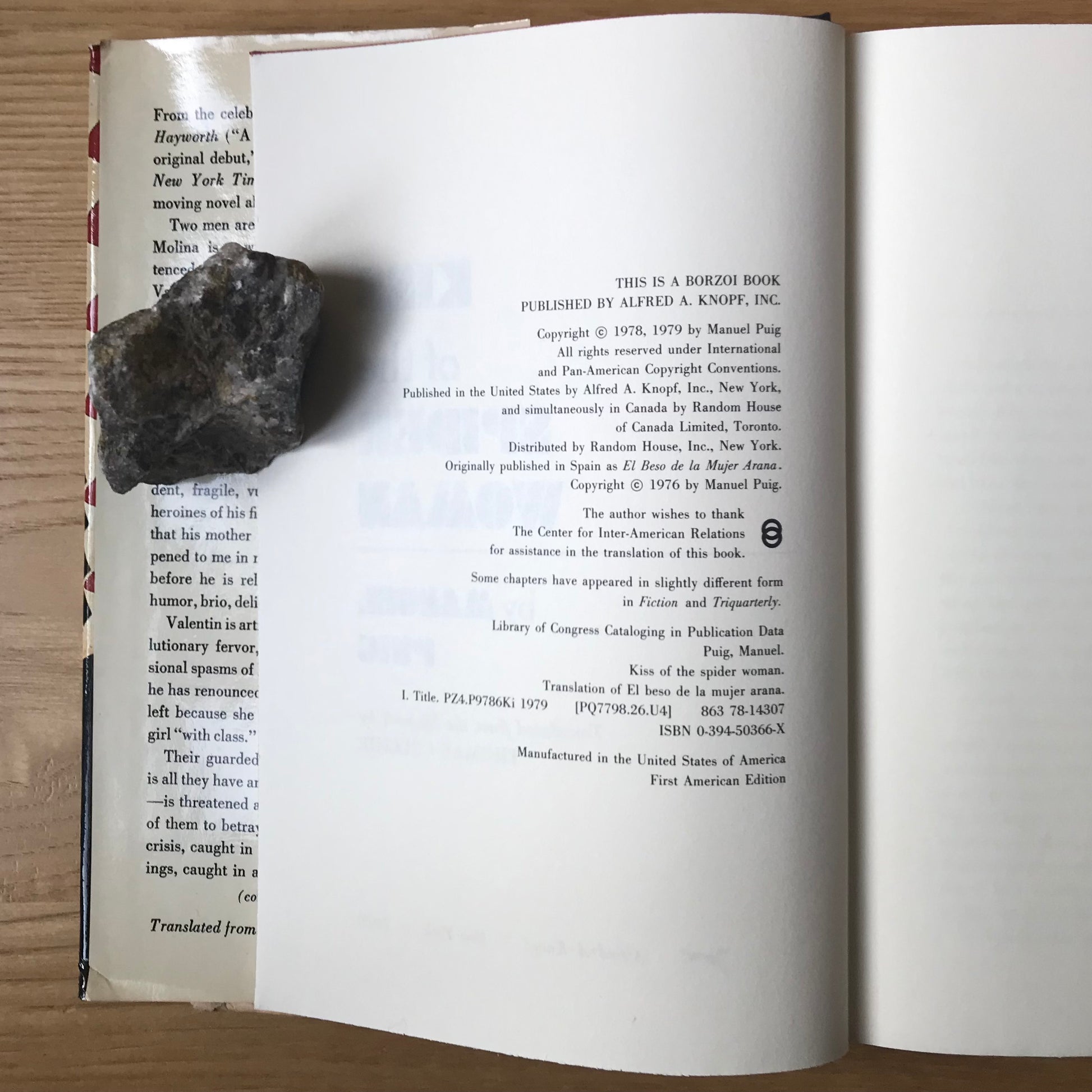 Puig, Manuel. Kiss of the Spiderwoman. Translated from the Spanish by Thomas Colchie. A. Knopf, 1979. Hardcover FIRST AMERICAN EDITION, 281 pp.