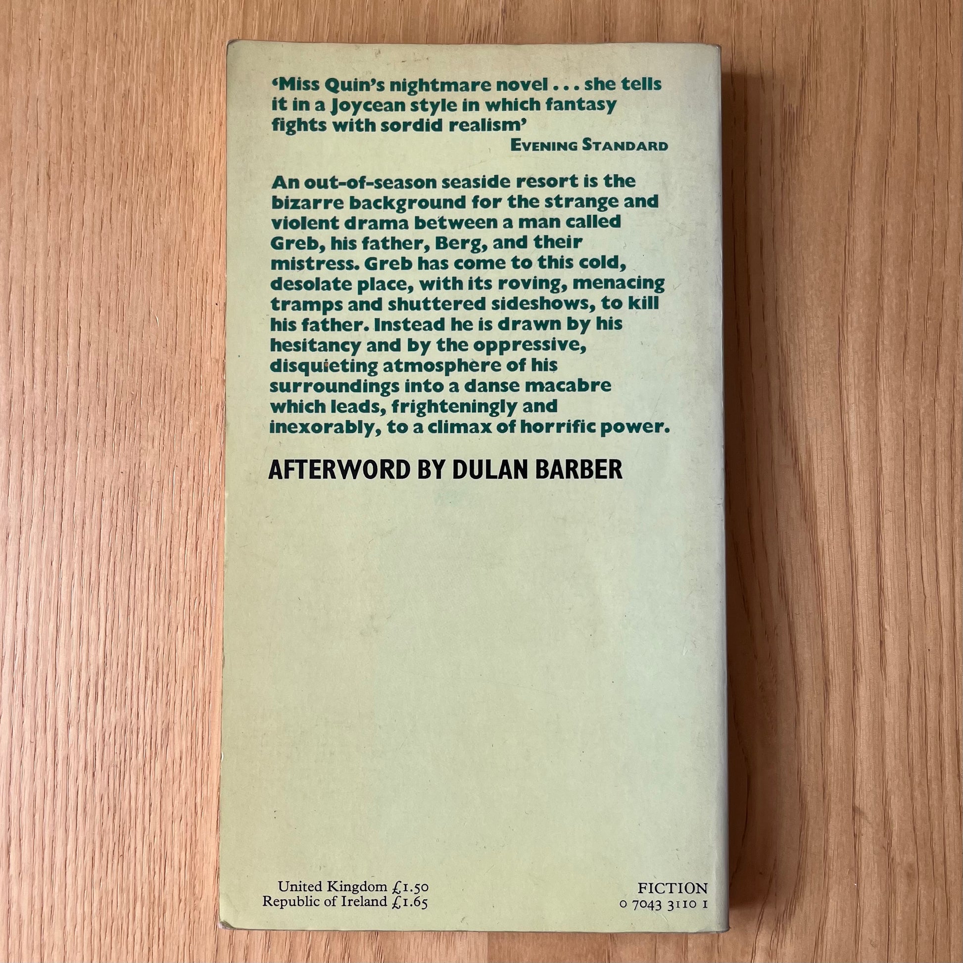 In the Freudian story of Berg, a man called Berg changes his name to Greb and comes to a seaside town to kill is father. Berg was Quin’s first novel and this pocket edition by Quartet is hard to find. It has an ex-libris sticker on the inside cover (“From the library of Mary-Jo Arn”), otherwise it’s in good condition and makes an excellent post-summer, sad and eerie cold desolate beach read.