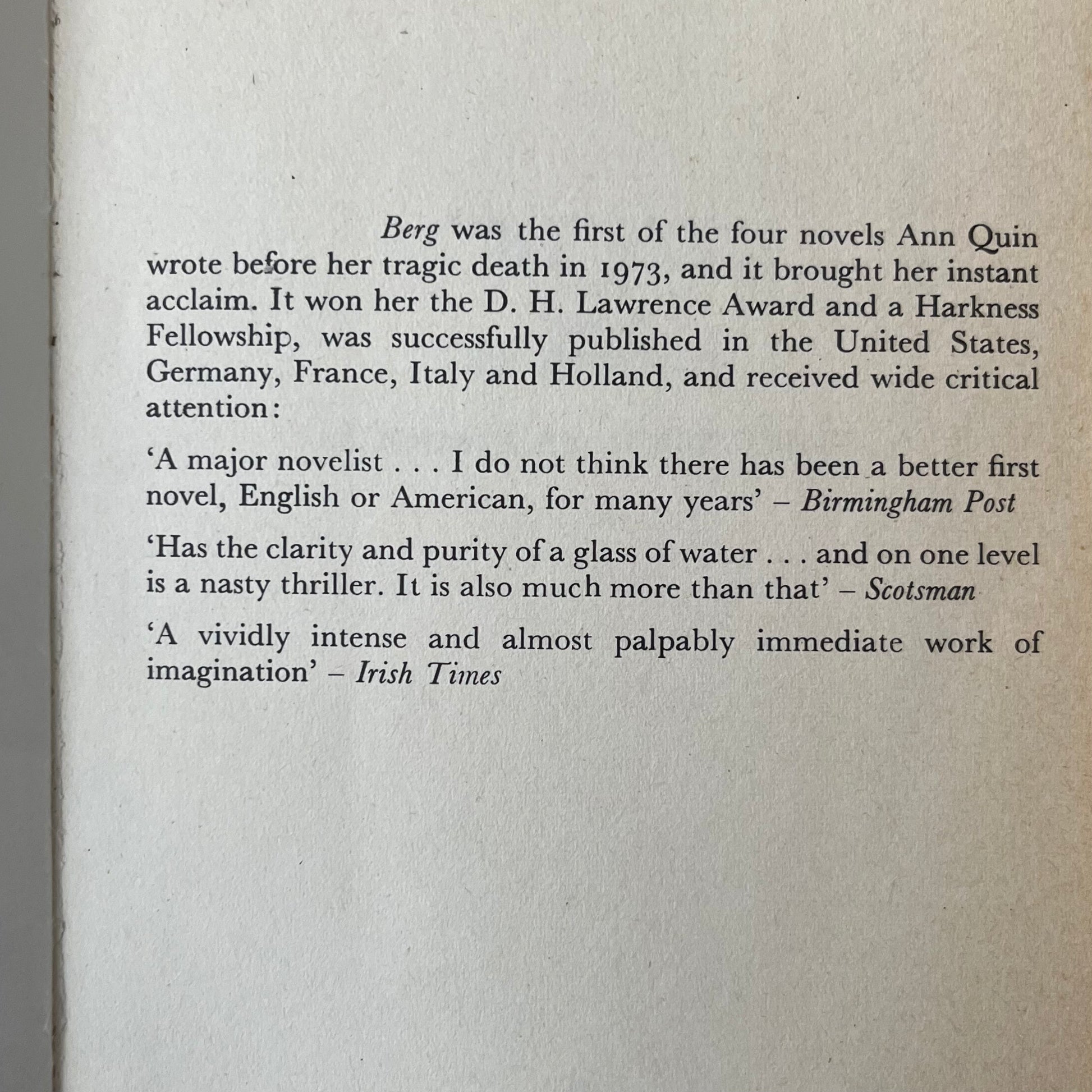 Quin, Ann. Berg. London: Quartet Books, 1977. 177pp. Paperback.